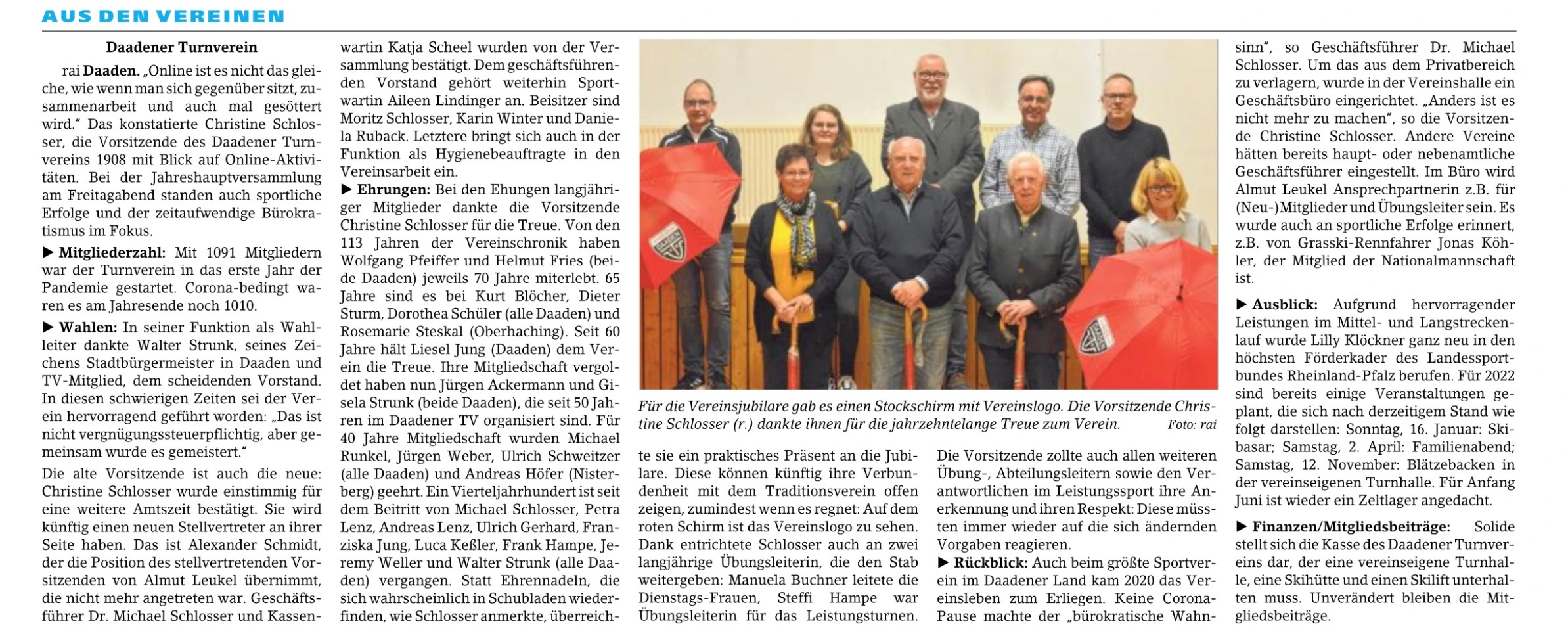 Bereits im November des letzten Jahres durften wir unter Einhaltung der zu diesem Zeitpunkt geltenden Corona-Regeln zur Jahreshauptversammlung in die vereinseigene Turnhalle einladen. Dieser Einladung sind trotz der widrigen Umstände erfreulicher Weise einige unserer über 1.000 Mitglieder gefolgt. Viele davon wurden für ihre lange Treue zum Verein geehrt, leiten aktiv Turngruppen oder bringen sich in der Vereinsspitze ein.