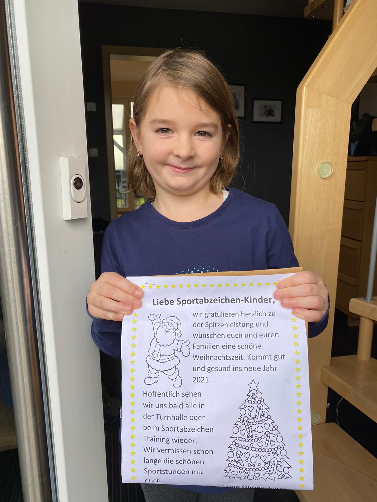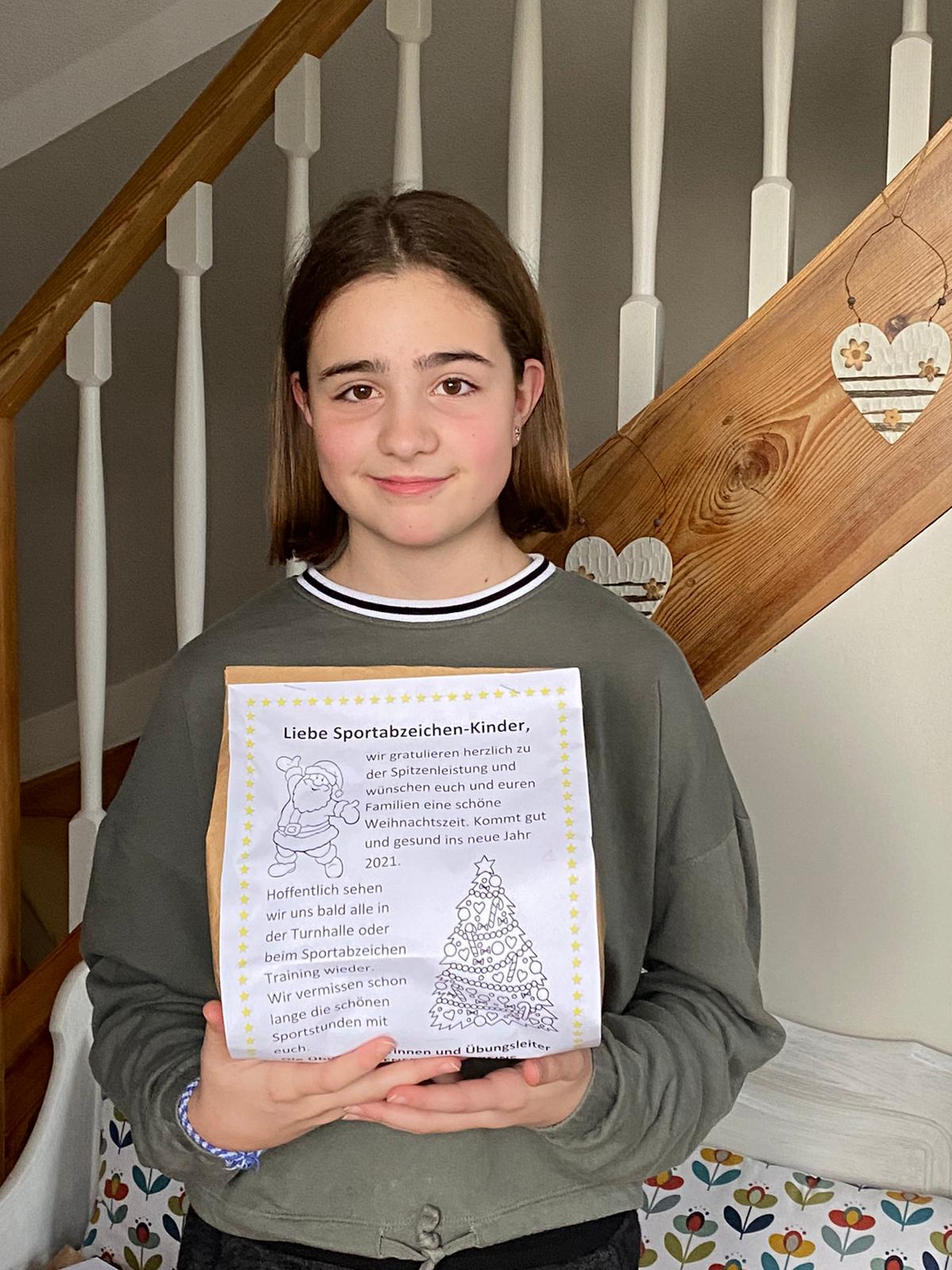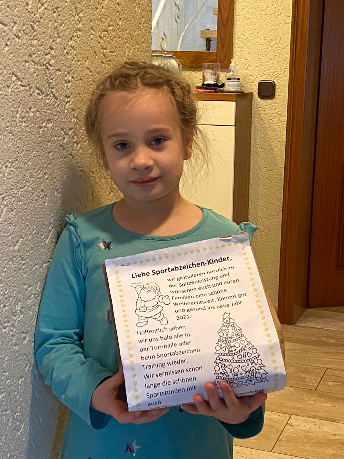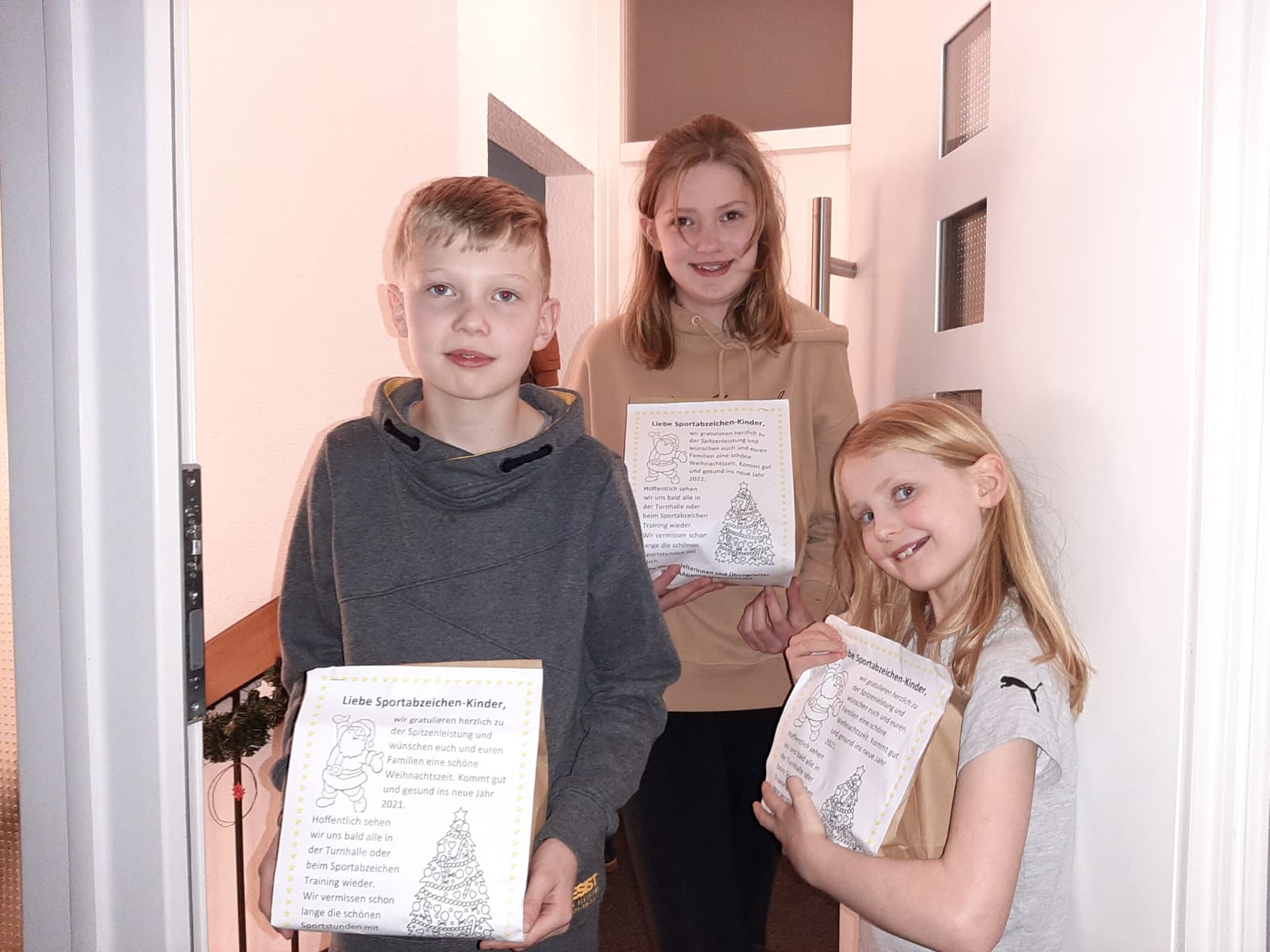 Die Sportabzeichenehrung konnte Corona-bedingt im letzten Jahr nicht am Nikolausturnen stattfinden. Darum überlegten sich unsere Übungsleiter für die 45 jungen Athleten (26 Mädchen und 19 Jungs) eine kleine vorweihnachtliche Überraschung. Die Sportabzeichen in gepackten Tüten wurden direkt an der Haustür an die Kinder übergeben. Darüber haben sich die Kinder sichtlich gefreut.